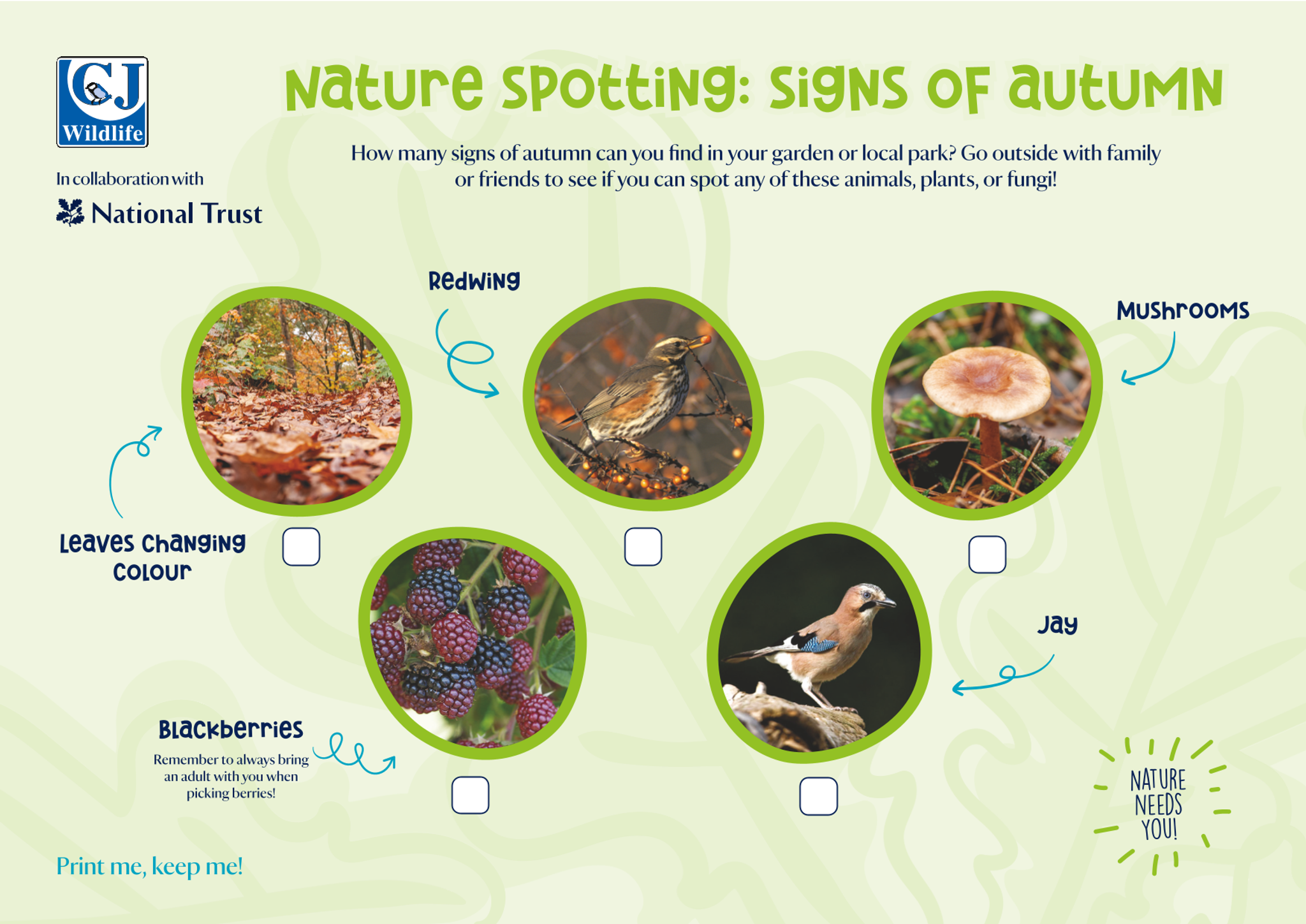 How many signs of autumn can you find in your garden or local park? Go outside with family or friends to see if you can spot any of these animals, plants, or fungi!